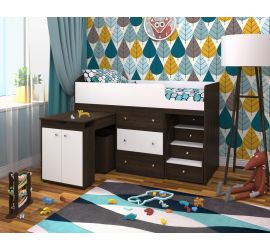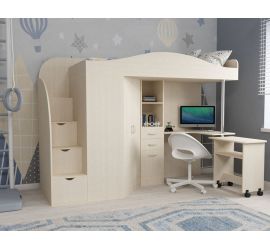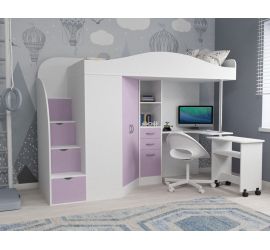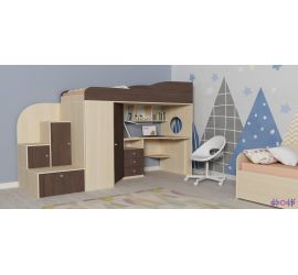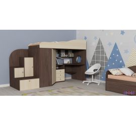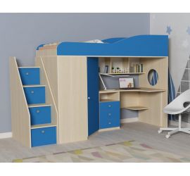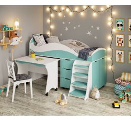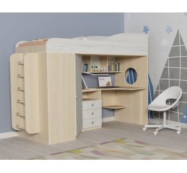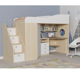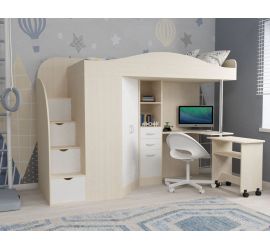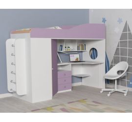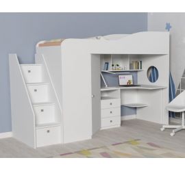 Второй вид кроватей-чердаков рассчитан на возраст детей от пяти лет. Спальное место в таком случае располагается на высоте 1,3-1,6 метра. На первом ярусе чаще всего есть шкаф и рабочая зона в формате письменного стола и книжных полок.