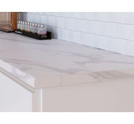 Обычно производители изготавливают столешницы толщиной 26 или 38 мм. Последние прочнее и красивее. За счет толщины и использования влагостойкого пластика при производстве столешницы отличаются высокой прочностью и большим сроком эксплуатации.